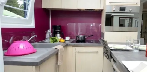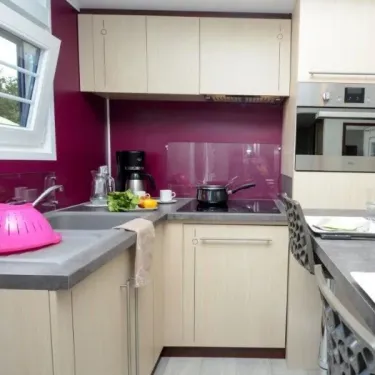 - Plaques électriques, micro-ondes, réfrigérateur, cafetière à capsules, vaisselle et ustensiles de cuisine inclus, lave-vaisselle, four et machine à laver