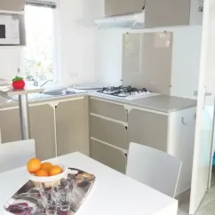 36 m² de surface, chambre avec 1 lit double, 2 chambres avec 2 lits simples, coin cuisine, salle d'eau, WC séparés, terrasse extérieure semi-couverte…