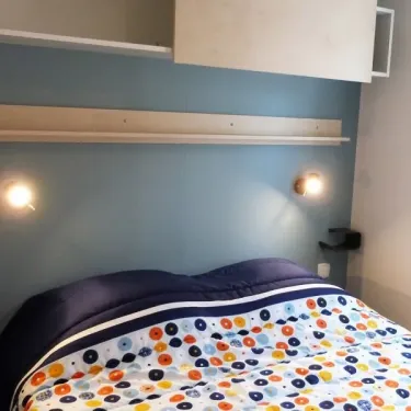 28.3 m² de surface, chambre avec 1 lit double, 2 chambres avec 2 lits simples, coin cuisine, salle d'eau, WC séparés, terrasse en bois extérieure semi-couverte…