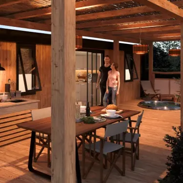 - Terrasse semi-couverte, cuisine extérieure, plancha