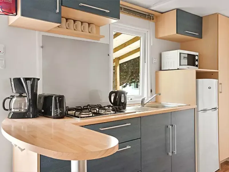 - Plaques cuisson, cafetière, micro-ondes, réfrigérateur, vaisselle et ustensiles de cuisines inclus