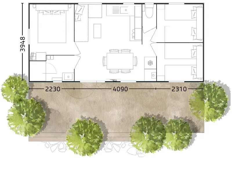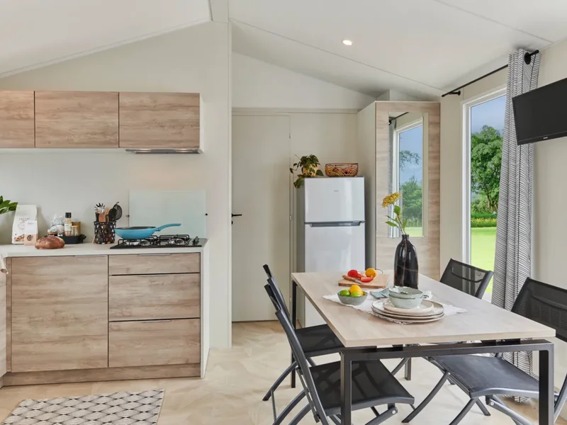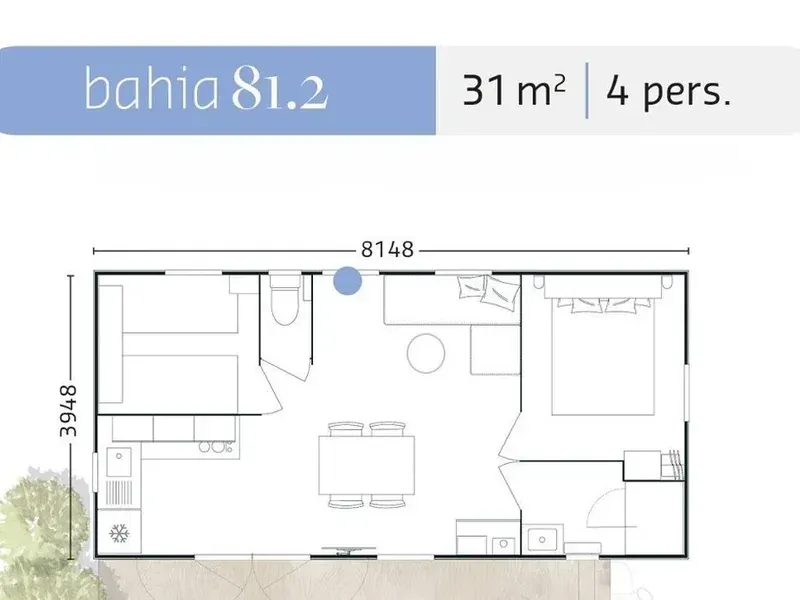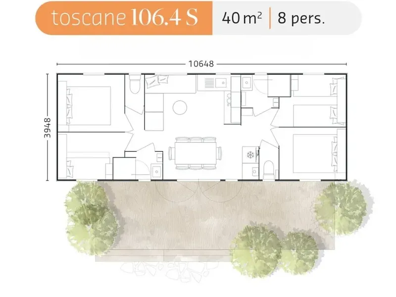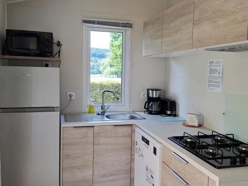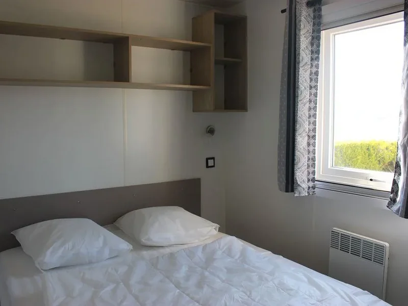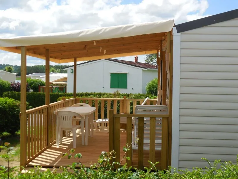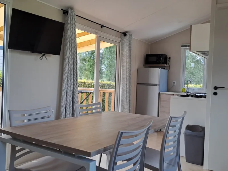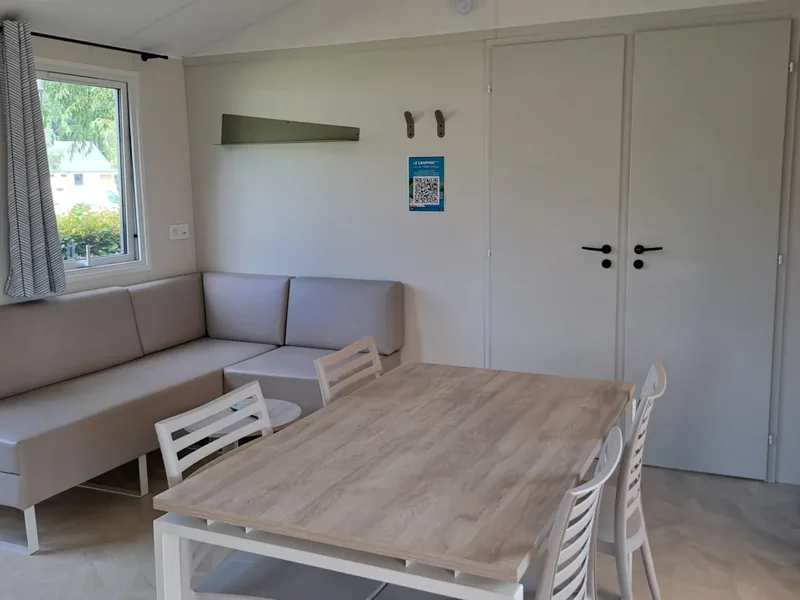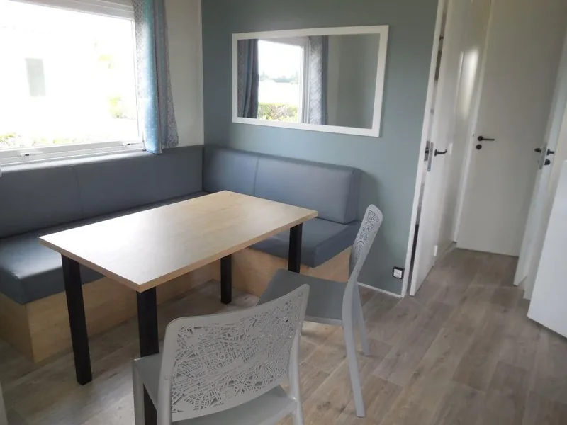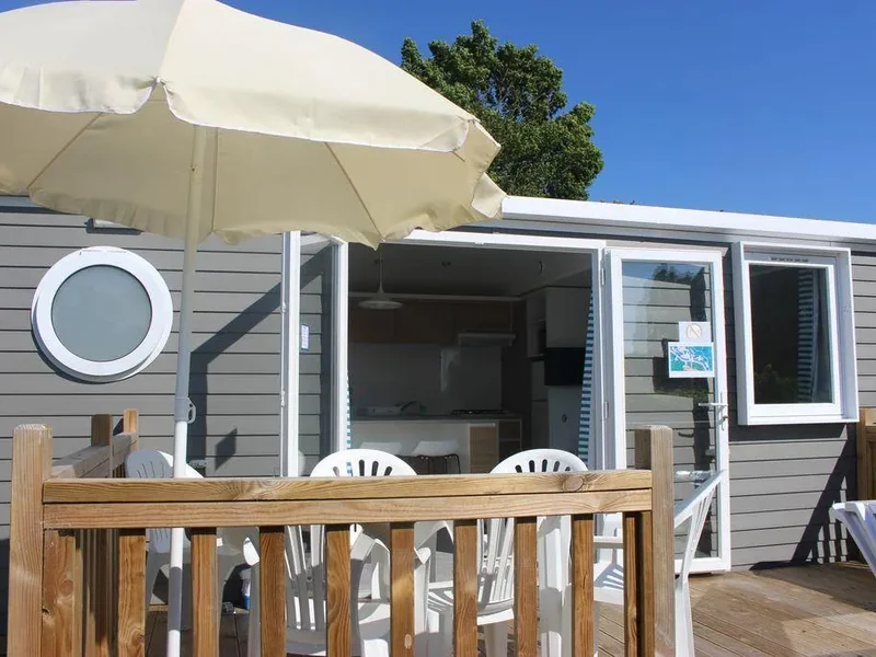 1 chambre avec 1 lit double, 1 chambre avec 2 lits simples superposés et 1 lit simple, coin cuisine, pas de sanitaires (sanitaires du camping), terrasse ...