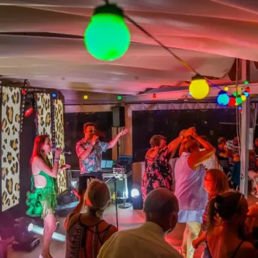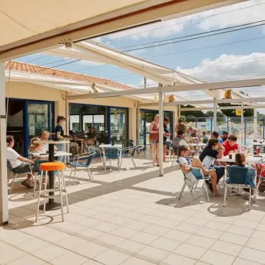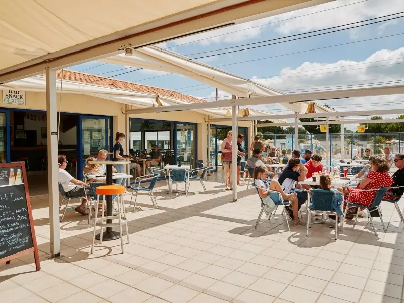 Partagez un moment convivial au bar-restaurant du camping, idéal pour un café, un repas ou un verre en terrasse avec vue sur la piscine.
