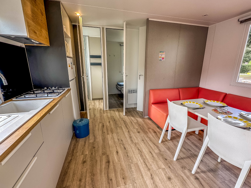 Surface de 25 m², chambre avec 1 lit double et 1 chambre avec 2 lits simples, séjour avec canapé convertible en lit 1 personne, coin cuisine, salle d’eau avec WC, terrasse semi-couverte