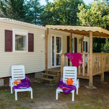 Surface de 33 m², 1 chambre avec 1 lit double (140x190), 1 chambre avec 2 lits simples superposés (80x190), 1 banquette convertible en lit double, cuisine équipée, télévision, salle de bain adaptée avec douche et WC, terrasse semi-couverte, salon de jardin...