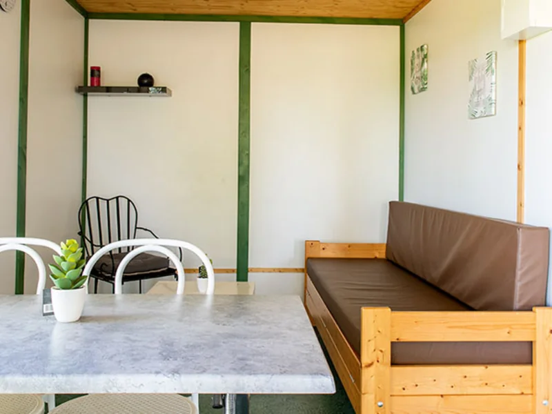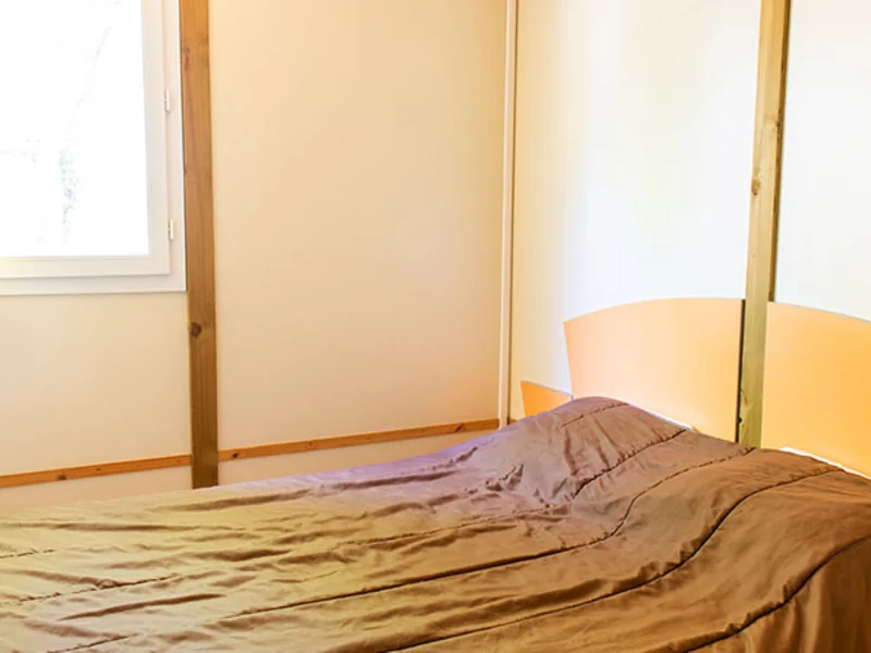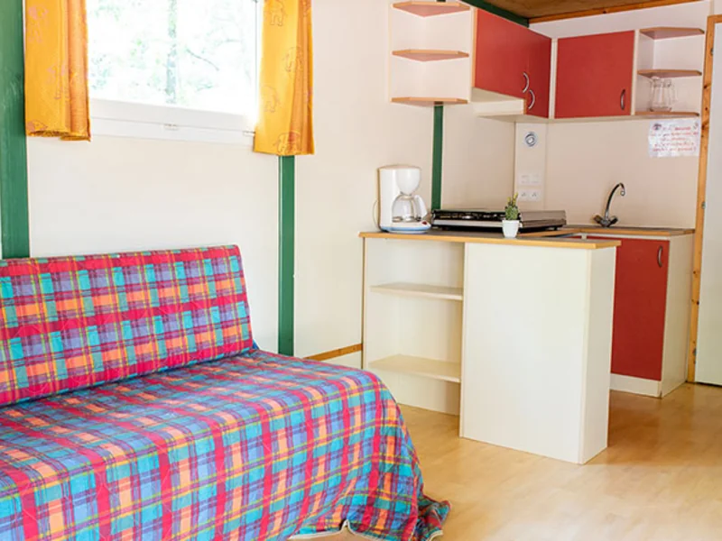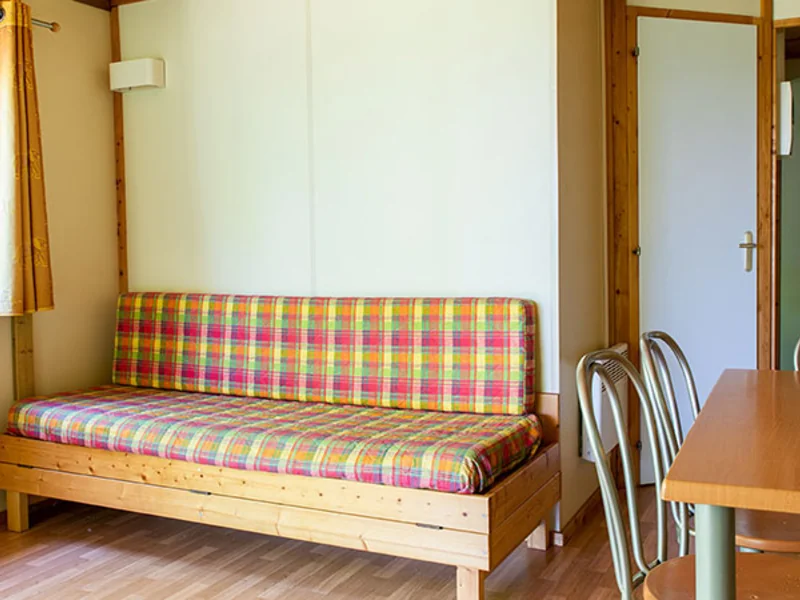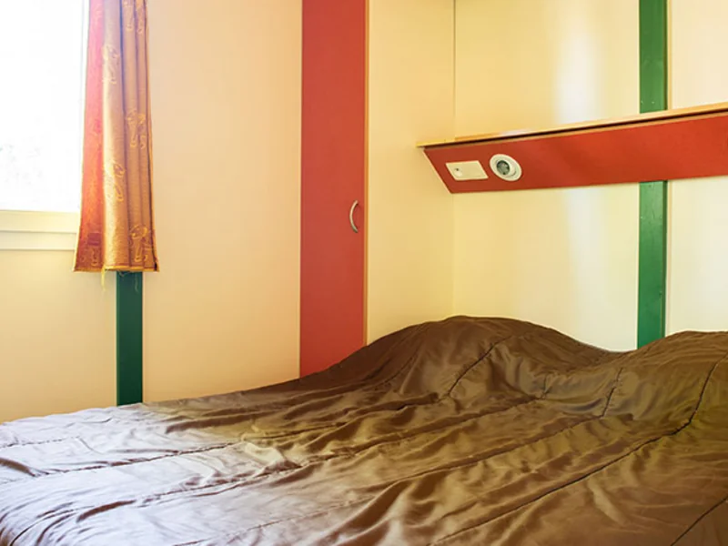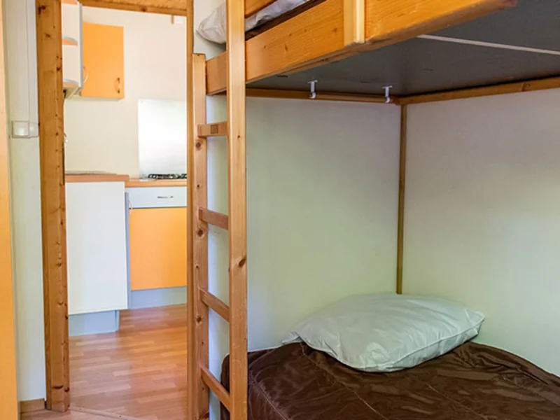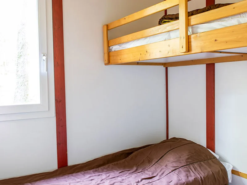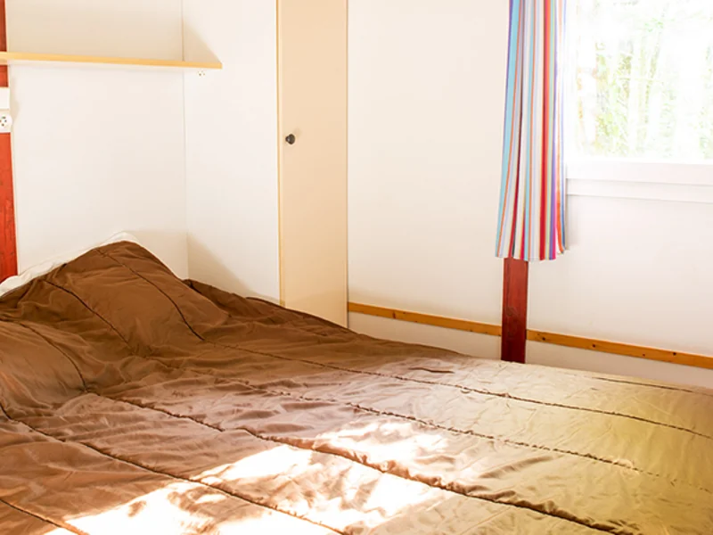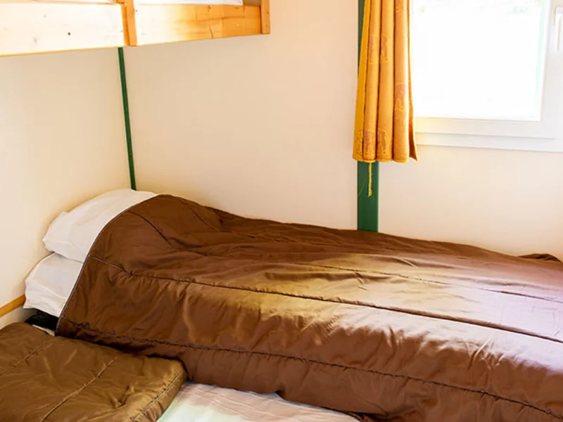 Une chambre avec 1 lit double, une chambre avec 3 lits simples dont 1 superposé, coin cuisine, pas de sanitaires (sanitaires du camping), terrasse semi-couverte...