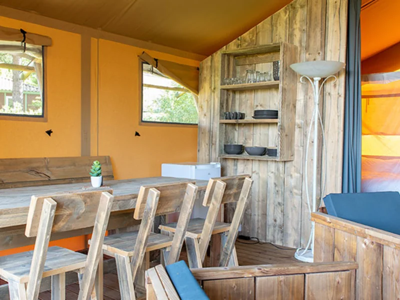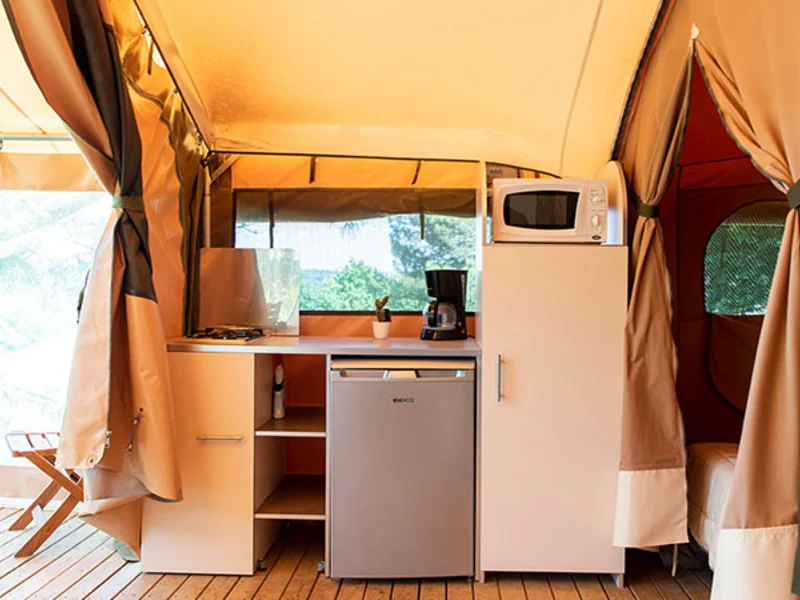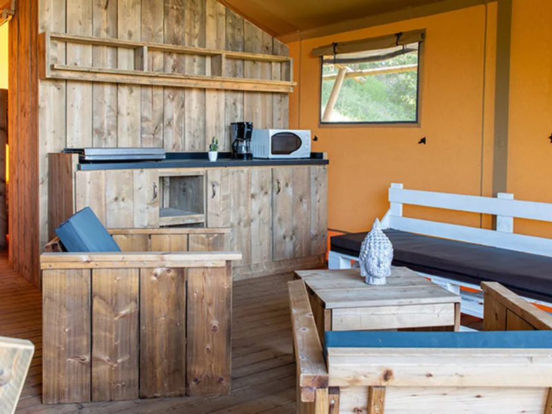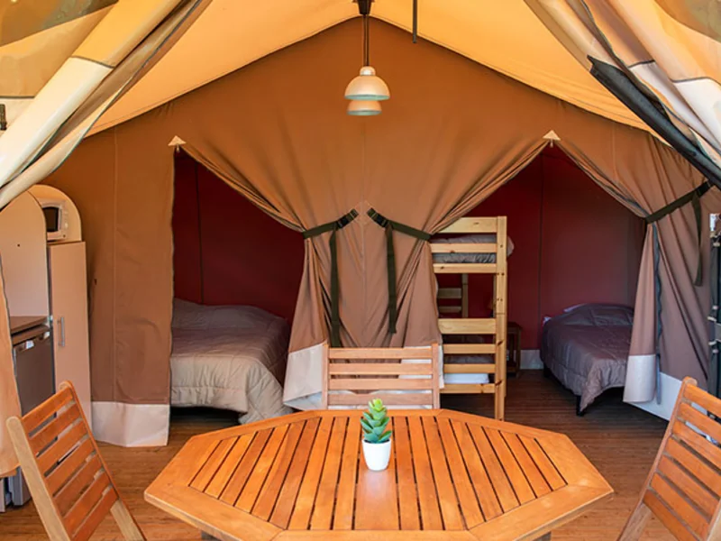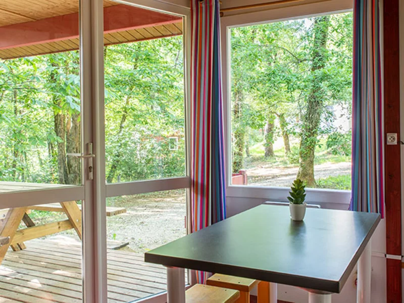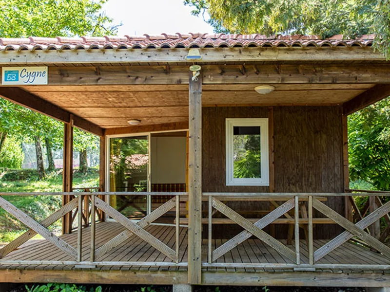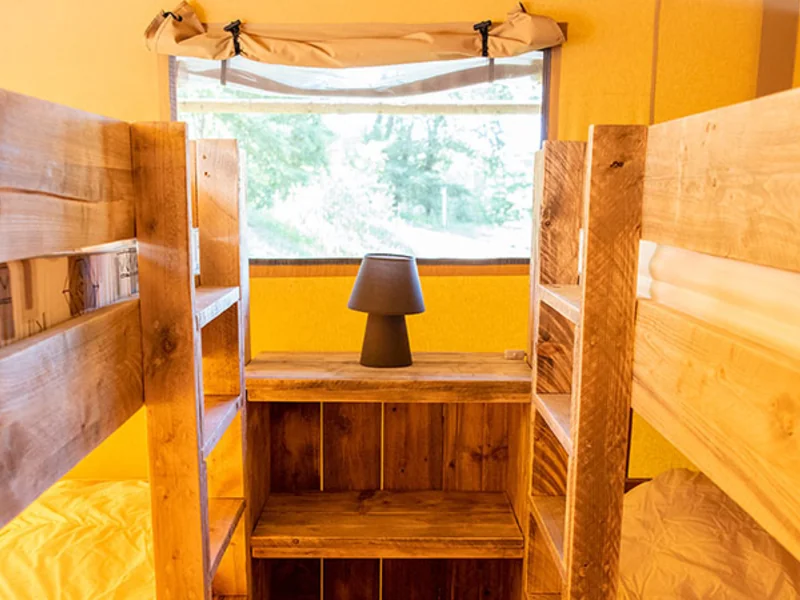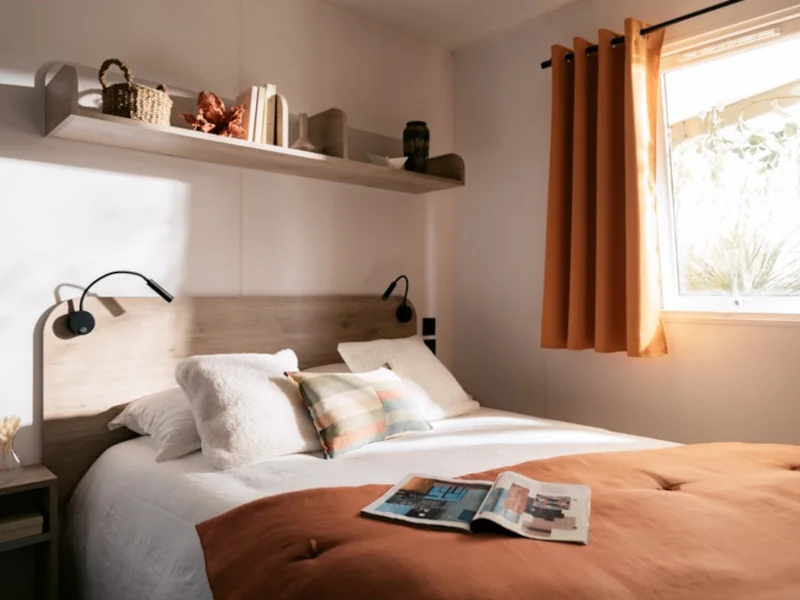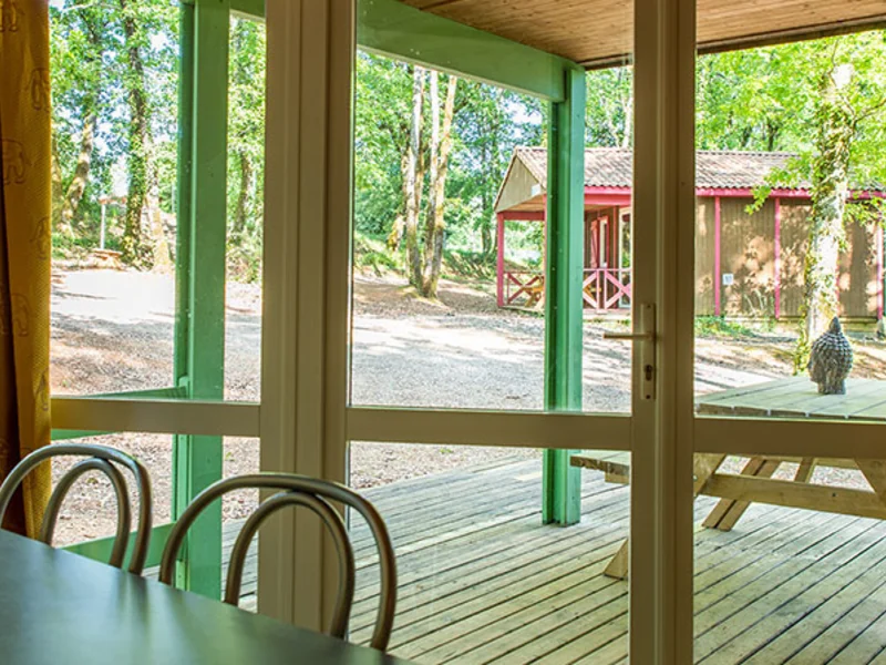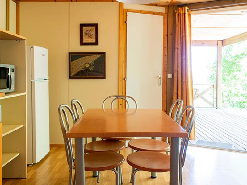 Une chambre avec 1 lit double, une chambre avec 3 lits simples dont 1 superposé, coin cuisine, pas de sanitaires (sanitaires du camping), terrasse semi-couverte...