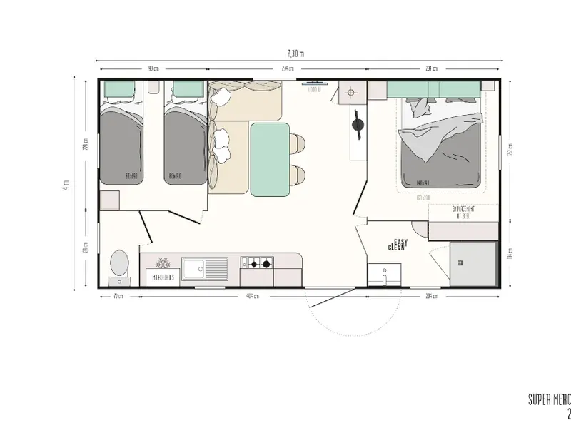 - Enfants : 2 Lits simples + 1 lit simple en hauteur de 80x190cm, oreillers et couvertures fournis