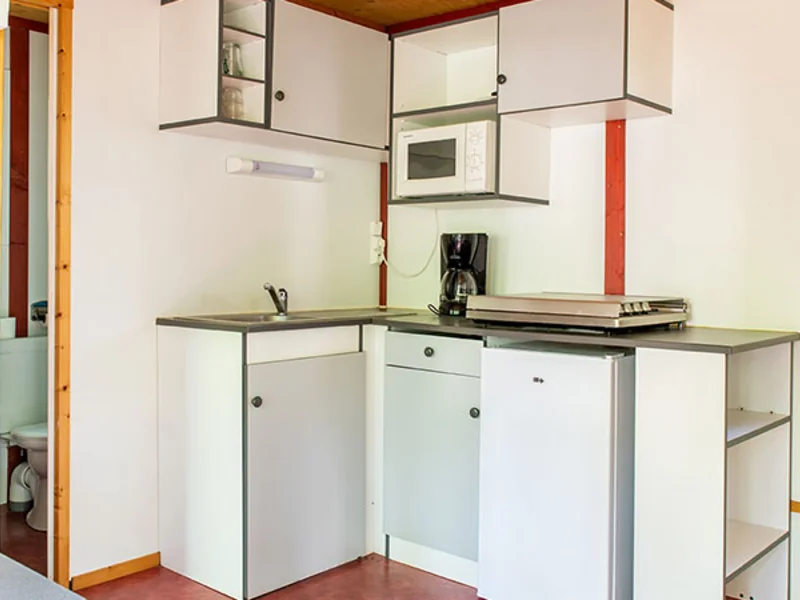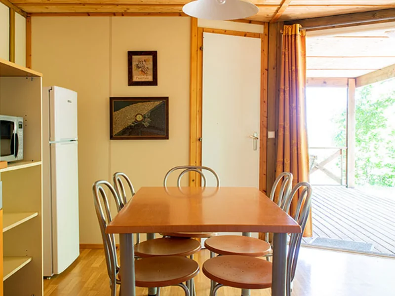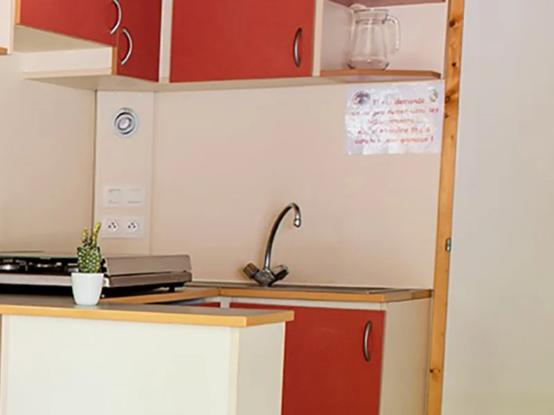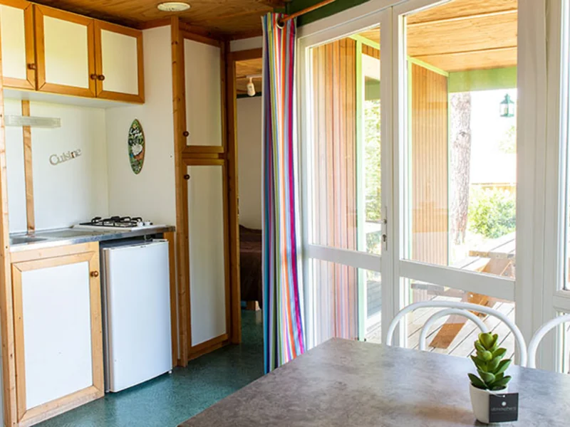 Une chambre avec 1 lit double, une chambre avec 4 lits superposés, coin cuisine, pas de sanitaires (sanitaires du camping), terrasse semi-couverte...