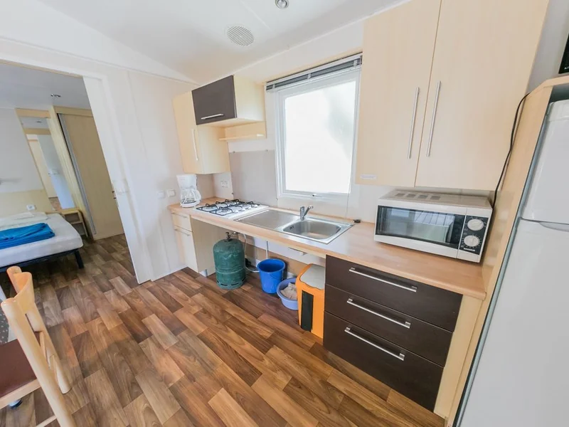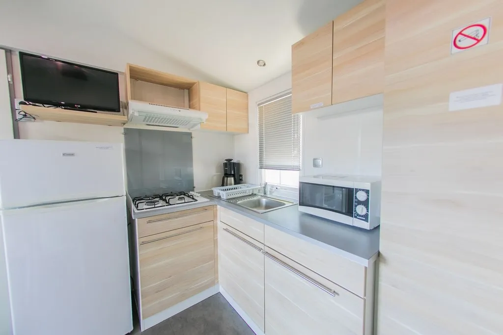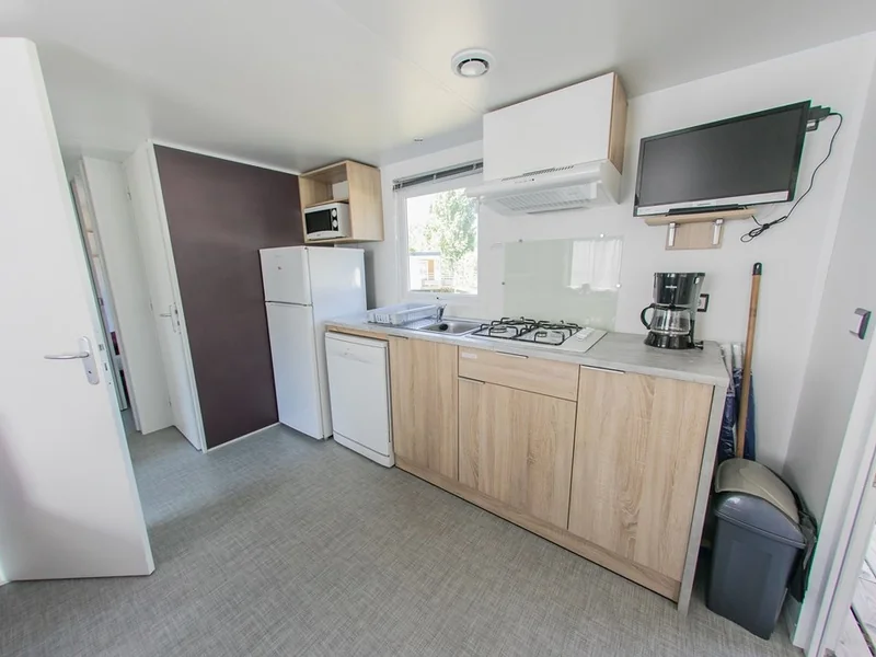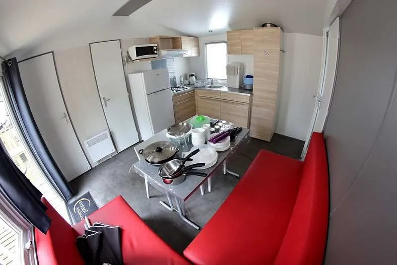 - Cuisine équipée avec plaque 4 feux, hotte aspirante, évier, réfrigérateur-congélateur, micro-ondes