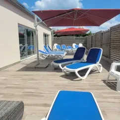40 m² de surface, 1 chambre avec 1 lit double, 2 chambres avec 2 lits simples, coin cuisine, télévision, 2 salles d’eau avec WC, terrasse...
