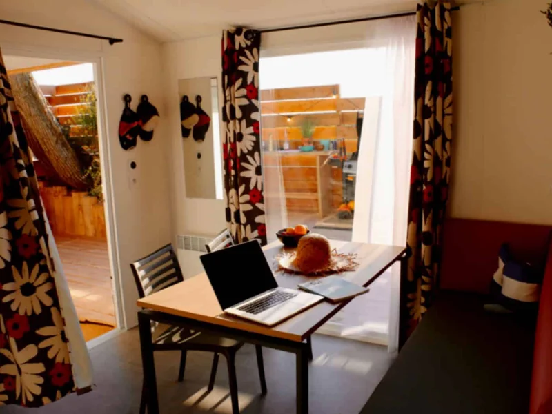 30 m² de surface, 1 chambre avec 1 lit double, 1 chambre avec 2 lits simples, coin cuisine, télévision, salle d’eau avec WC adaptés PMR, terrasse...
