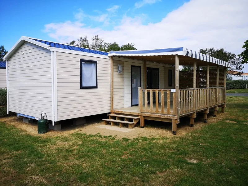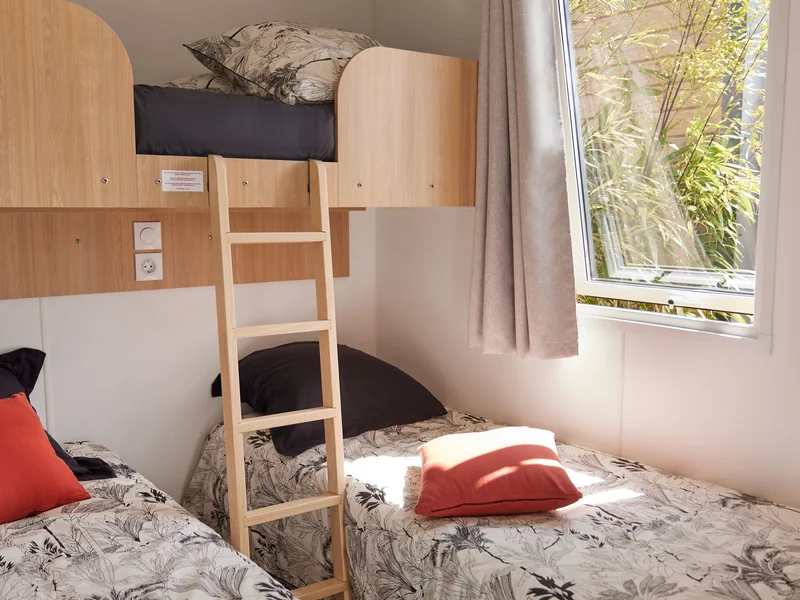 27 m² de surface, 1 chambre avec 1 lit double, 1 chambre avec 2 lits simples, salle d'eau avec lavabo, douche et WC séparés, cuisine équipée, climatisation, télévision, terrasse avec salon de jardin...