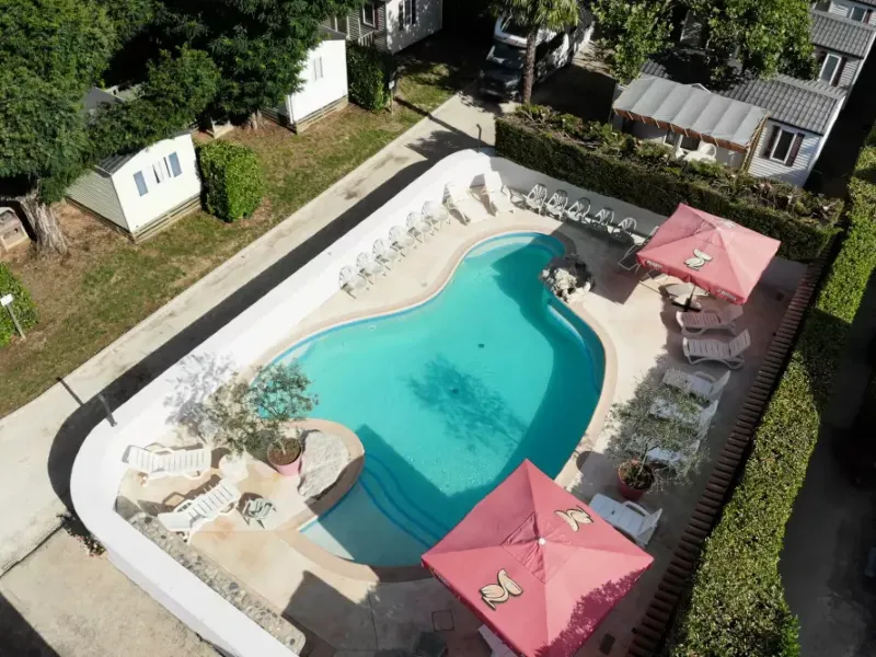 Pendant les journées ensoleillées, venez vous rafraîchir dans l'espace aquatique du camping qui propose une piscine extérieure ainsi que des transats pour bronzer.