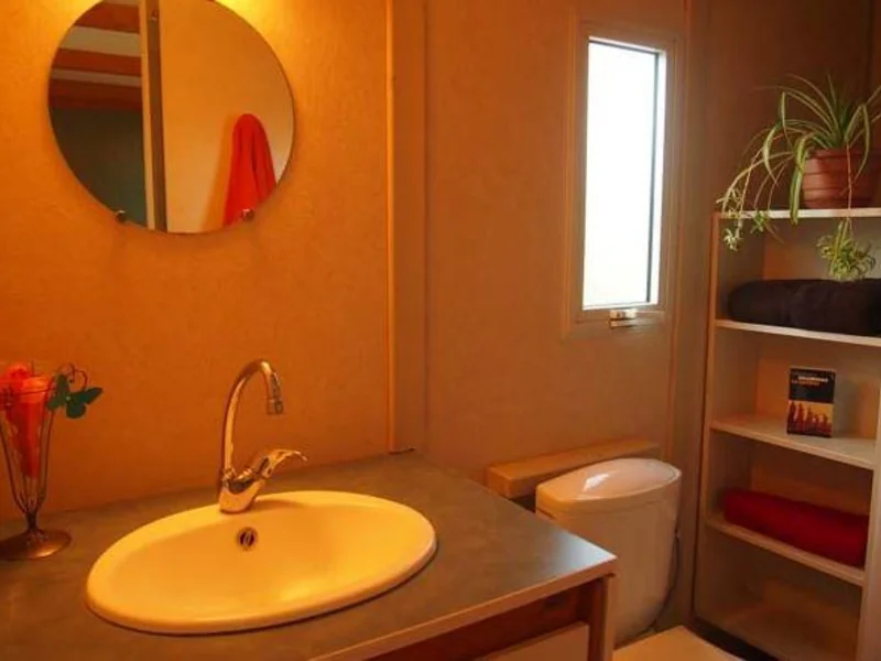 30 m² de surface + terrasse 9 m² semi-couverte, 1 Chambre avec 1 Lit double et 1 chambre avec 2 Lits superposés et un lit simple. Séjour avec banquette convertible en lit double (15 ans maximum). Coin Cuisine.