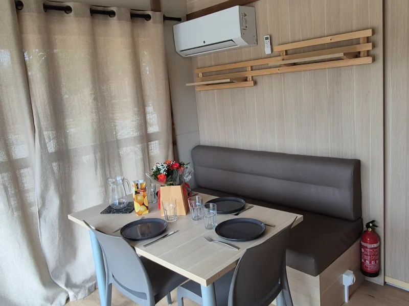 Surface de 25 m², 1 chambre avec 1 lit double, 1 chambre avec 3 lits simples dont 1 superposé, salle d'eau avec lavabo, douche et WC séparés, cuisine équipée, climatisation, télévision, terrasse avec salon de jardin...