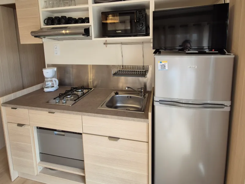 - Plaques cuisson, micro-ondes, réfrigérateur-congélateur, cafetière, lave-vaisselle, vaisselle et ustensiles de cuisines inclus
