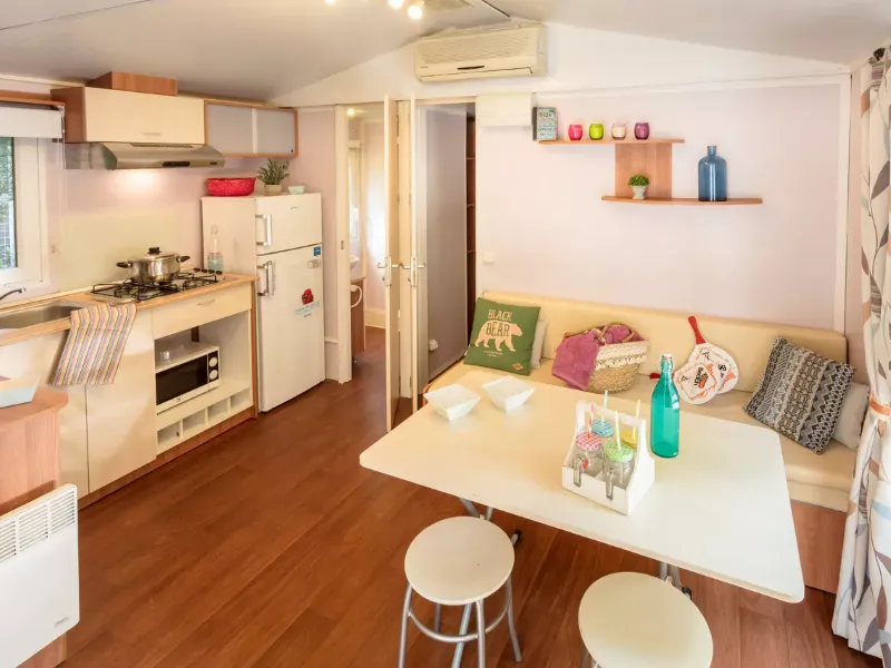 - Banquette-lit : 130x190cm (couchage impossible pour enfants de plus de 15 ans), table et chaises, climatisation, télévision