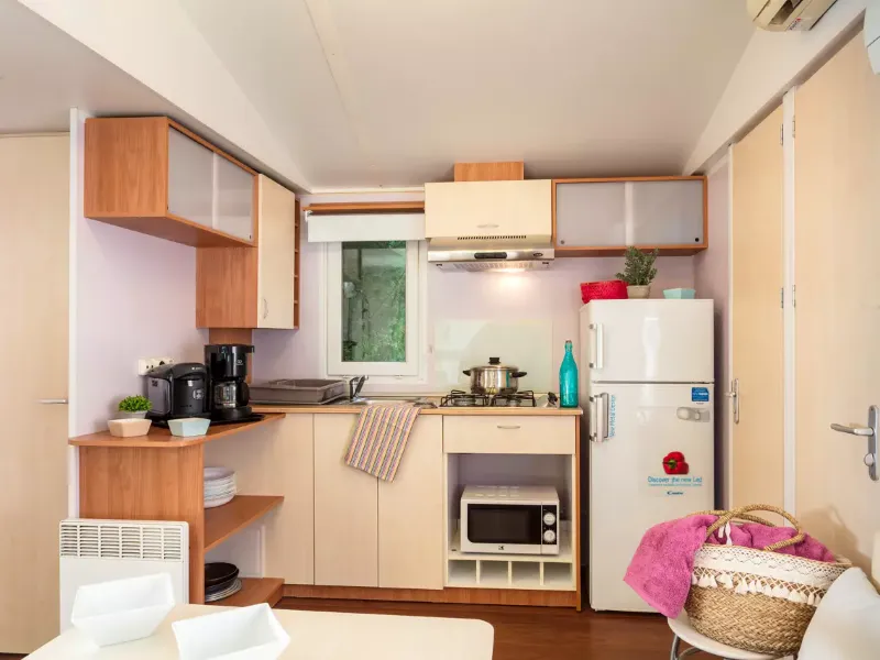 - Cafetière électrique à filtre, cuisine équipée, évier, micro-ondes, plaque de cuisson 4 feux gaz, réfrigérateur avec freezer