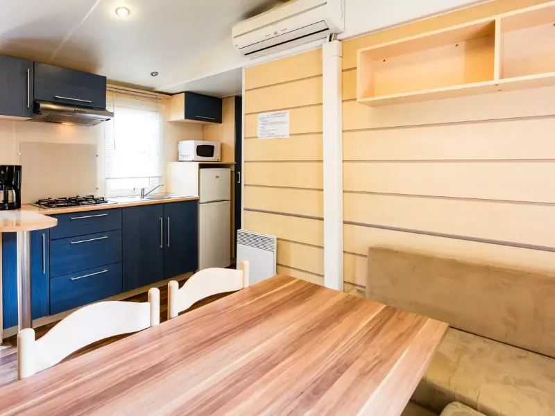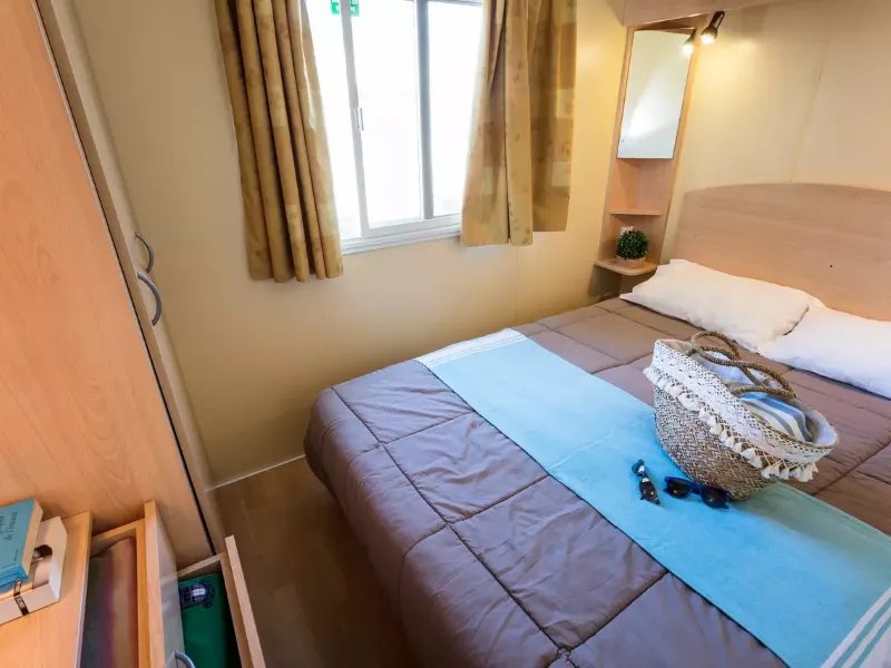 20 m² de surface, 1 chambre avec 1 lit double, 1 chambre avec 2 lits simples, banquette, coin cuisine, salles de douche, WC, terrasse...