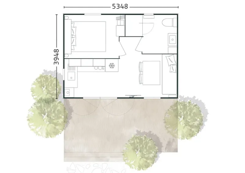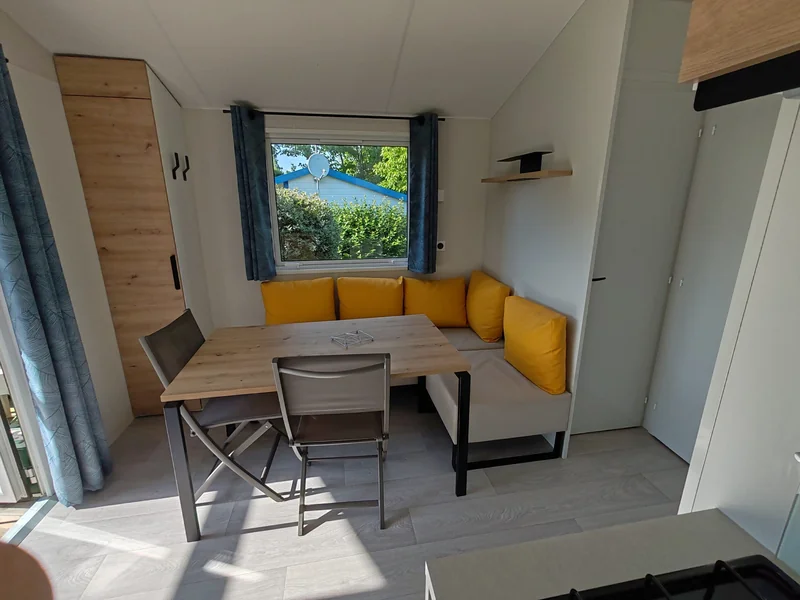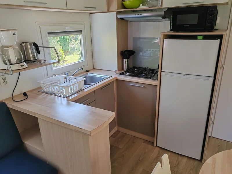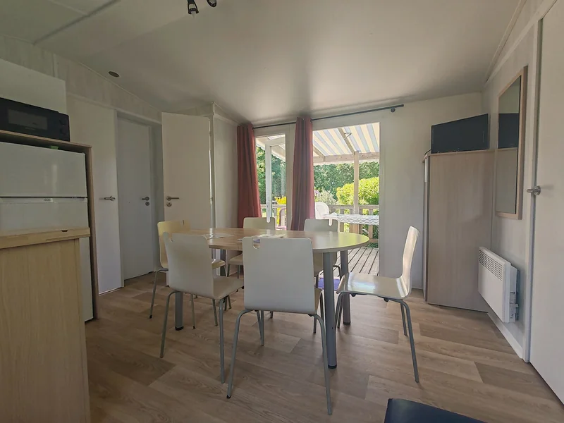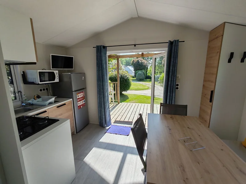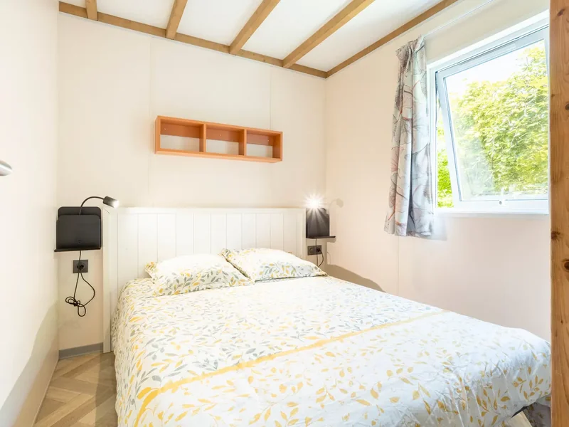 21 m² de surface, chambre avec 1 lit double, 1 chambres avec 2 lits simples, pas de WC ni de salle de bain (équipements sanitaires du camping), réfrigérateur, micro-onde, terrasse couverte...