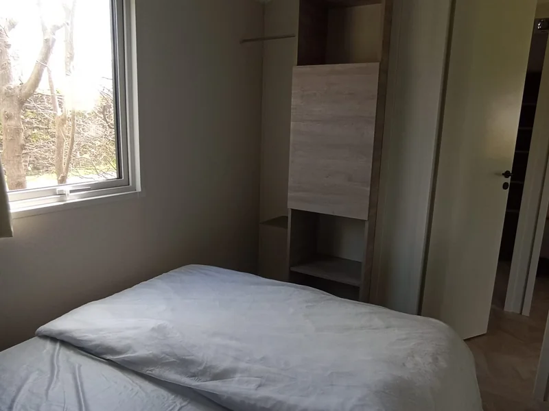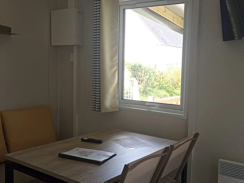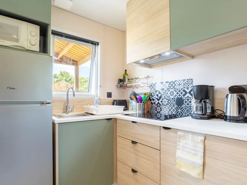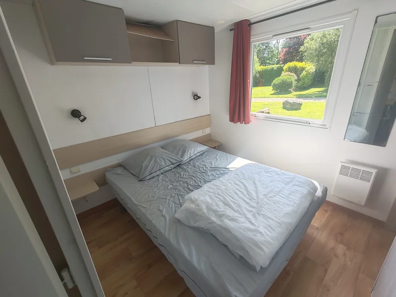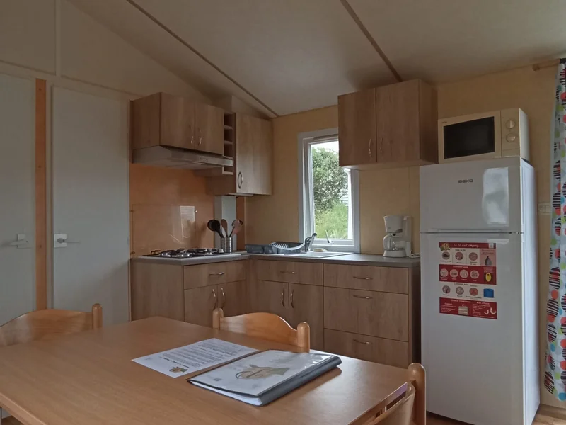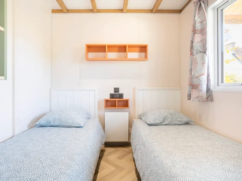 16 m² de surface, chambre avec 1 lit double, 1 chambres avec 2 lits simples, pas de WC ni de salle de bain (équipements sanitaires du camping), réfrigérateur, four/micro-onde, terrasse couverte...