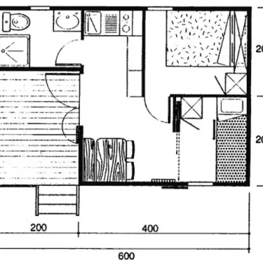 - Enfants : Coin chambre comprend deux lits superposés de 70 x 190 cm qui peuvent être séparés du coin cuisine par une cloison