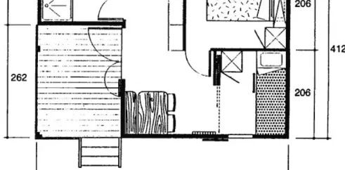 Coin chambre comprend deux lits superposés qui peuvent être séparés du coin cuisine par une cloison