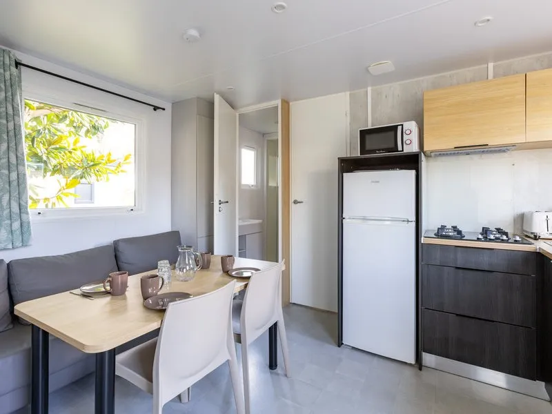 Surface de 23 m², 1 chambre avec 1 lit double, 1 chambre avec 2 lits simples ou superposés, salle d'eau avec lavabo, douche et WC séparés, cuisine équipée, terrasse et salon de jardin...