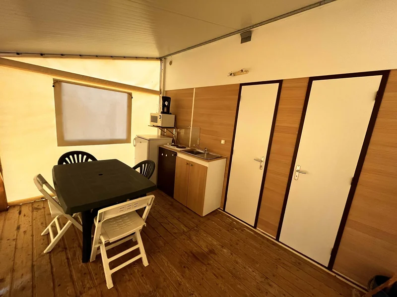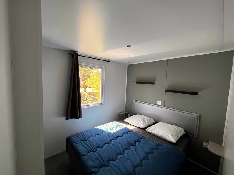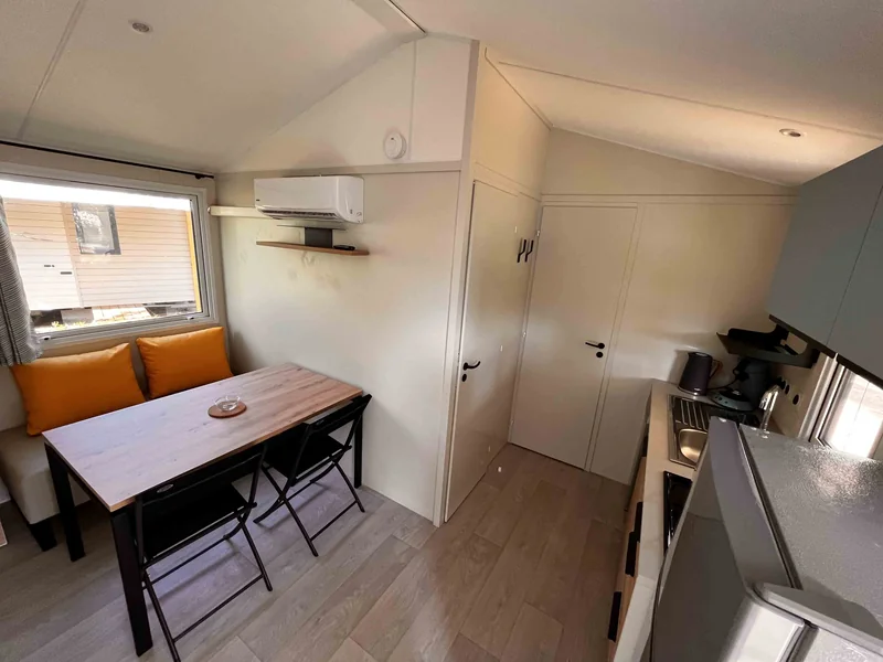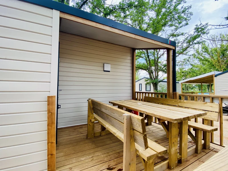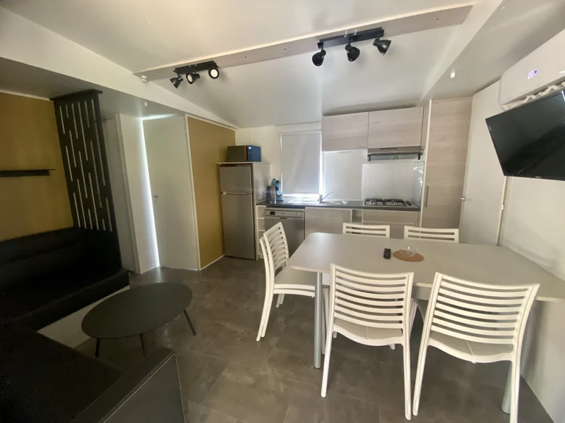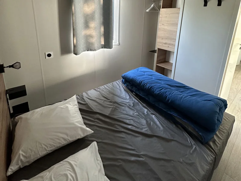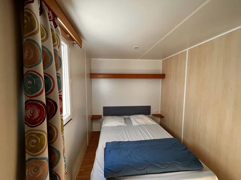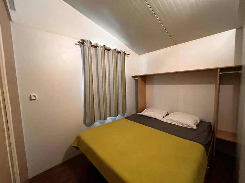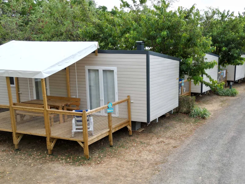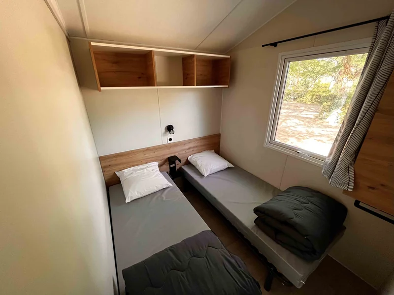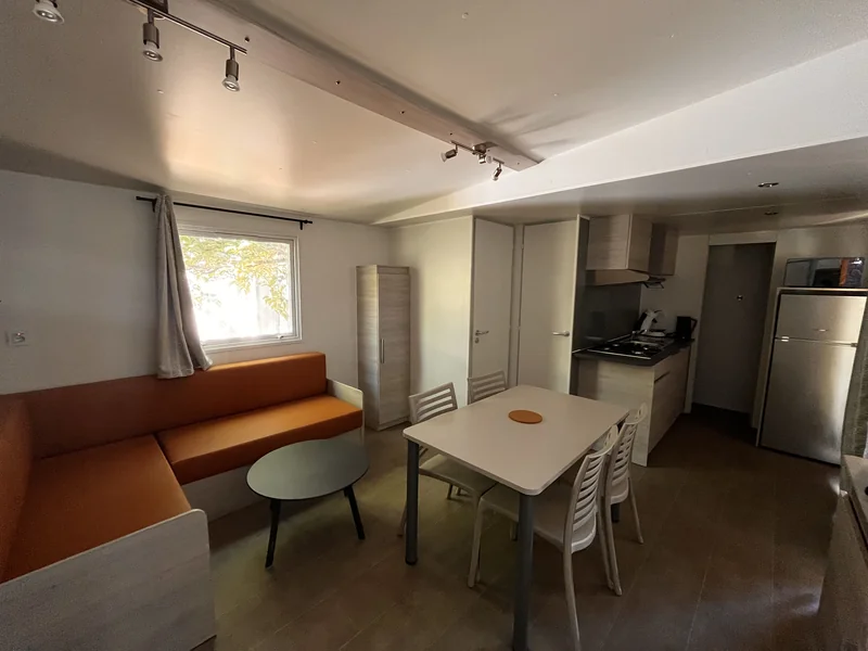 Surface de 20 m², 1 chambre avec 1 lit double, 1 chambre avec 1 lit simple et 1 lit superposé pour enfant, coin cuisine, pas de sanitaires, WC, salon de jardin, parasol...
