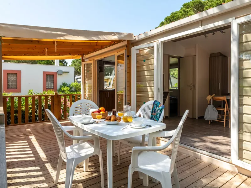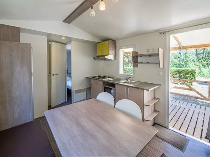 Surface de 26 m², chambre avec un lit double, chambre avec deux lits simples, banquette convertible, coin cuisine, douche avec WC, terrasse...