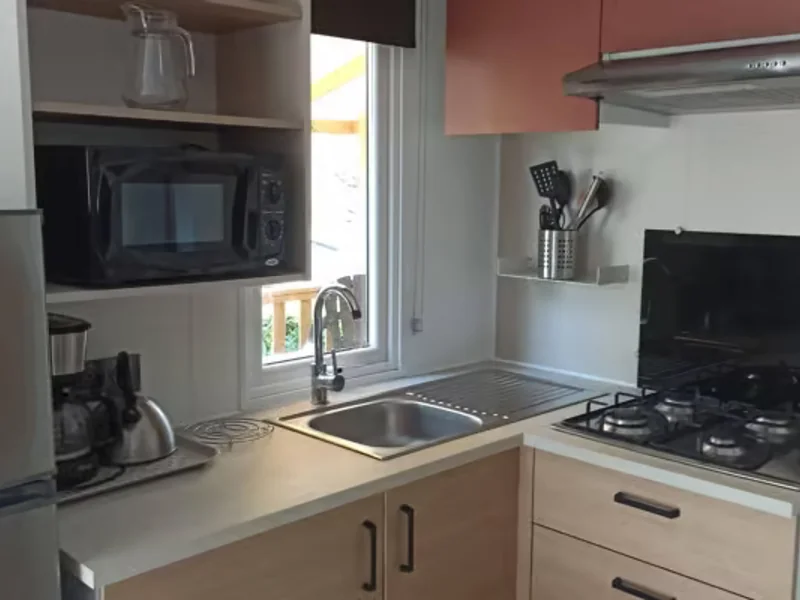 - Plaques cuisson, micro-ondes, réfrigérateur, cafetière, bouilloire, vaisselle et ustensiles de cuisines inclus