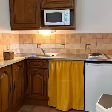 - Réfrigérateur - freezer, évier, plaques de cuisson 2 feux, bouilloire, cafetière électrique, micro-ondes, ustensiles de cuisine