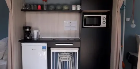 - Réfrigérateur, four micro-onde, cafetière et bouilloire électriques, vaisselle inclus (Pas de plaques de cuisson)