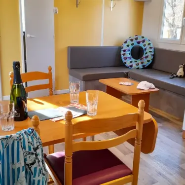 - Banquette convertible en 2 couchages (130x190), table, chaises, climatisation