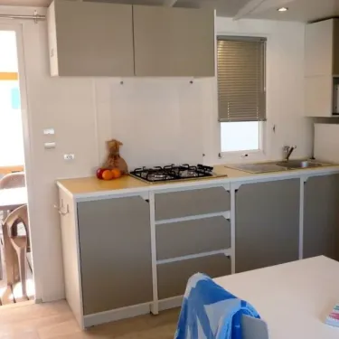 26.1 m² de surface, chambre avec 1 lit double, 1 chambre avec 2 lits simples, séjour convertible, coin cuisine, salle d'eau, WC séparés, terrasse en bois extérieure semi-couverte…