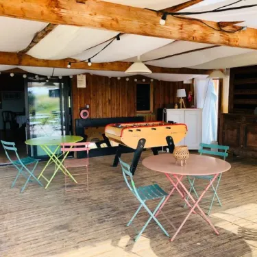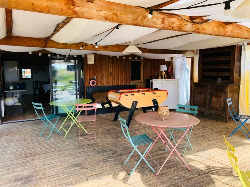 3 couchages hors chambres, micro-ondes, pas de WC ni de salle de bain (équipements sanitaires du camping), barbecue et table extérieure, 2 transats, parasol.