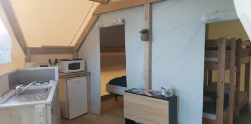 - Plaques cuisson, micro-ondes, réfrigérateur, cafetière électrique, vaisselle et ustensiles de cuisines inclus