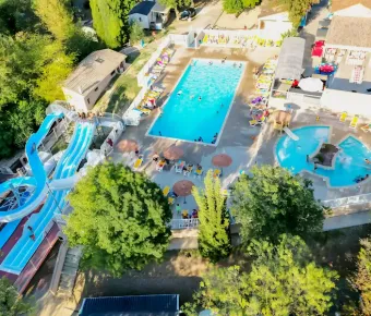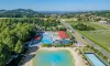 Vue aérienne du camping Lou Pignada avec piscines et mobil-homes