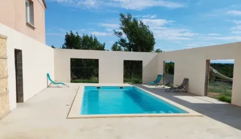 Piscine avec transats blancs sous un ciel bleu à Camping Les rives du Luberon