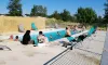 Personnes dans la piscine du Camping Les Lacs du Verdon, avec toboggan en arrière-plan.