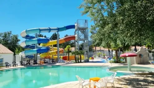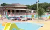 Camping Le Sen-Yan : piscine extérieure avec toboggan vert et structures en toit de tuiles.