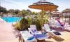 Piscine bleue avec chaises longues et parasols en paille au Camping Mer et Camargue