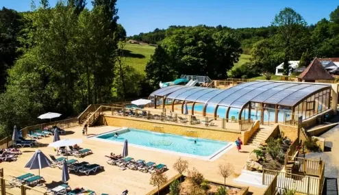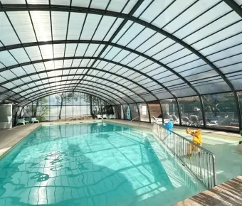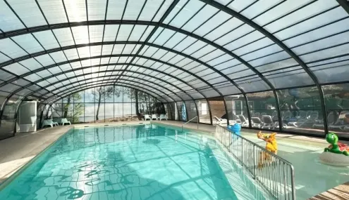 Piscine couverte avec toboggan bleu et chaises longues autour, dans le camping.