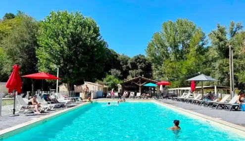Piscine avec transats et parasols au Camping Les rives du Luberon