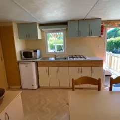 - Table de cuisson 4 feux, four micro-ondes, frigo, cafetière électrique