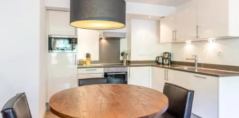 - Plaques cuisson, cafetière, réfrigérateur-congélateur, lave-vaisselle, micro-ondes, four, grille-pain, bouilloire, vaisselle et ustensiles de cuisines inclus
