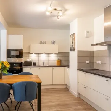 - Plaques cuisson, cafetière, réfrigérateur-congélateur, lave-vaisselle, micro-ondes, bouilloire, vaisselle et ustensiles de cuisines inclus