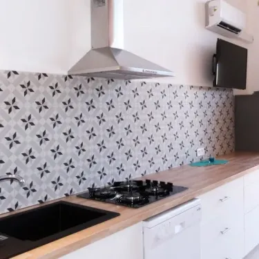 - Plaques gaz, micro-ondes, grand réfrigérateur-congélateur, cafetière, lave-vaisselle, vaisselle et ustensiles de cuisine inclus