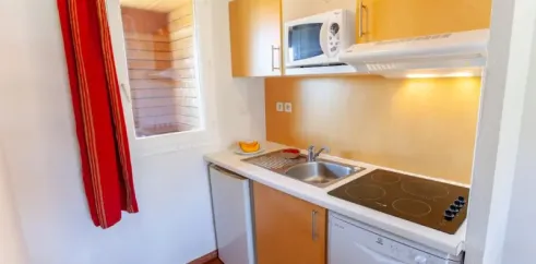 - Cuisine avec des plaques vitrocéramiques, un réfrigérateur, un grille-pain, une hotte, un lave-vaisselle, un micro-ondes, une cafetière électrique et une bouilloire